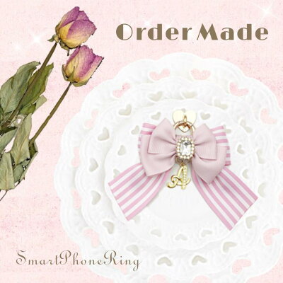 スマホ リング パピヨンストライプ アルファベット・イニシャル チャーム  スマホ リング オーダーメイド iphone 全機種 韓国 シンプル おしゃれ かわいい 人気 カラビナ ホルダー バンカーリング 落下防止 フィンガーリング リボン スマホアクセサリー 【送料無料】
