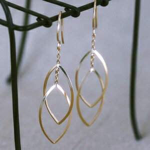 )ラインで魅せる、しなやかなフォルム・・! K10カラーゴールドピアス・クエリオ >>K18のページはコチラ<< なめらかなフォルムが、優しげに揺れる・・ 暑い季節には、 長い髪もアップヘアーにしたり、ハーフアップにしたり、 涼しげで爽やかにしたくなるもの・・! そんなときは、 つけるアクセサリーも軽やかな方がいい! 軽やかなのに、存在感のあるピアスを おつくりしました・・! ゴールドの繊細なラインで、 葉っぱのような形にデザインし、 2つ連ねてピアスをおつくりしました・・! 1つは、フックからすぐにつなげて、 もう1つはチェーンにつなげて 上のモチーフを通して、90度角度をつけました。
